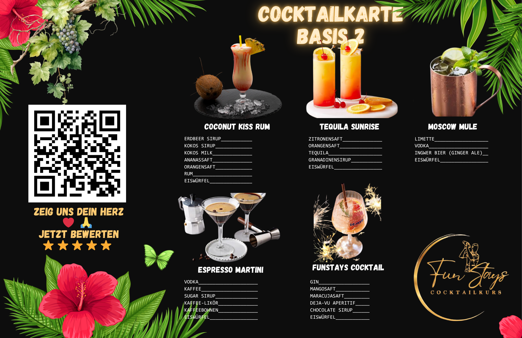 Unter Anleitung unseres erfahrenen Barkeepers mixt ihr fünf außergewöhnliche Cocktails, Schritt für Schritt – von fruchtig bis exotisch, von cremig bis spritzig.